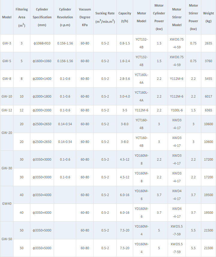 External filtration type drum vacuum filter consists of cylinder, transmission structure, allocation head, main shaft, agitation device, slurry tank, scraper and coiling device etc.