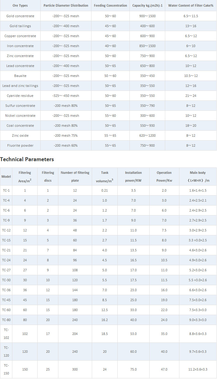 It can be widely used in concentrate and tailings dewatering of mining non-ferrous metals, rare metals, ferrous metal, and nonmetals. Dewatering of oxide, electrolytic slag, leaching residue, slag in chemical industry, sewage and mud disposal engineering and so on. The particle size of the materials can be realized from -200 to -450 meshes.