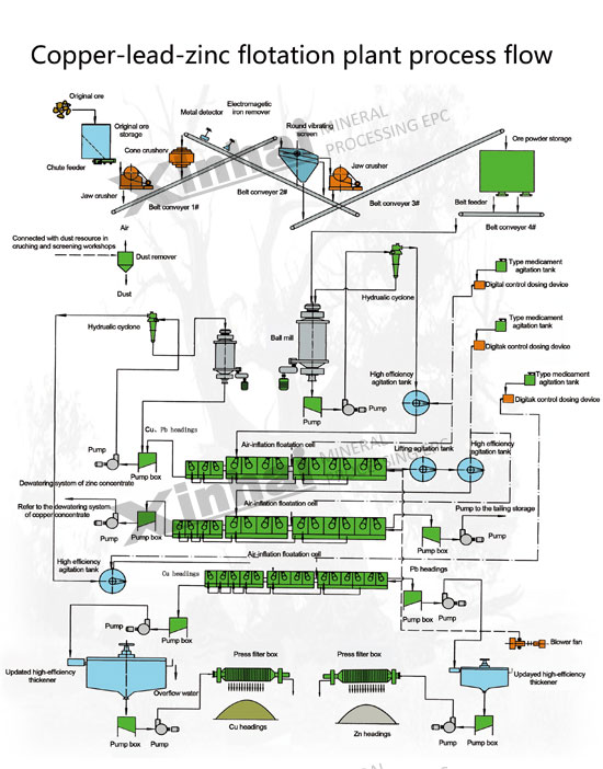 A lead-zinc dressing plant in Yunnan, , due to the mining depth increasing, ore properties had changed and the grade of lead and zinc concentrate decreased, so the original flotation is not suitable. After field investigation and analysis, Xinhai determined the process according to multi tests: mixed flotation, preferential flotation of copper lead concentrate, regrinding and re-floating of copper lead concentrate, and equipped with the Xinhai equipment.